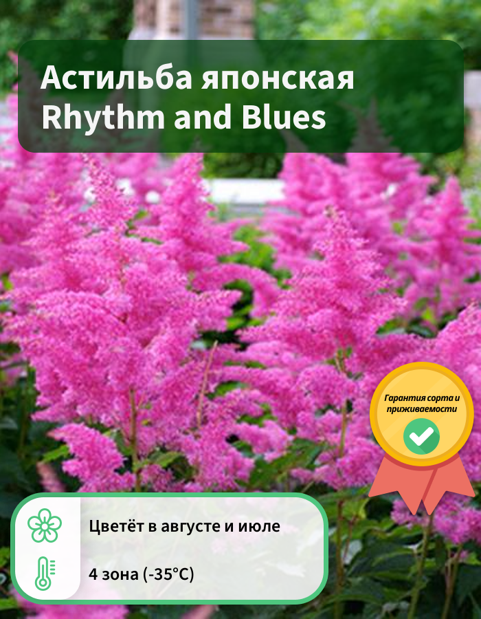 Рассада Астильба японская Ритм энд Блюз (Rhythm and Blues) к пику своего цветения достигает размера 60 сантиметров и представляет собой плотные и пушистые соцветия с сочным ярко-розовым цветом. Листья у данного вида очень крупные темно-зеленых оттенков. Семена необходимо высеивать на подготовленную и богатую удобрениями почву. Оптимальное место произрастания - затененные участки вблизи водоемов. Период цветения выпадает на конец июля - август. Среди отличительных особенностей астильбы японской Ритм энд Блюз можно выделить: - хорошо переносит зимовку; - не подходит для районов с сухим климатом; - отличается обильной и мощной корневой системой; - отлично сочетается с папоротниковыми и декоративными хвойными.