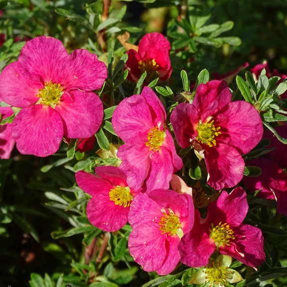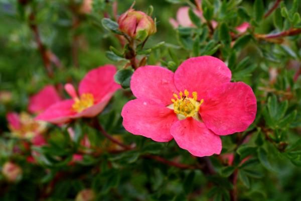 Саженцы Лапчатки кустарниковой Дэнни Бой (Danny Boy) густо-ветвящийся кустарник, в высоту не превышающий 80 сантиметров, а вот крона достигает 150 сантиметров. Лист визуально напоминает лапку и состоит из нескольких мелких листочков светло-зеленого цвета. Цветы ярко-малинового оттенка, растут в большом количестве и на протяжении всего лета. Лапчатка кустарниковой Дэнни Бой – светлолюбивое растение, но высаживать его на открытых солнечных лучах все, же не стоит. Почва требуется плодородная, дренированная, но в целом куст не сильно капризен к условиям посадки. Стоит отметить и его морозоустойчивость.