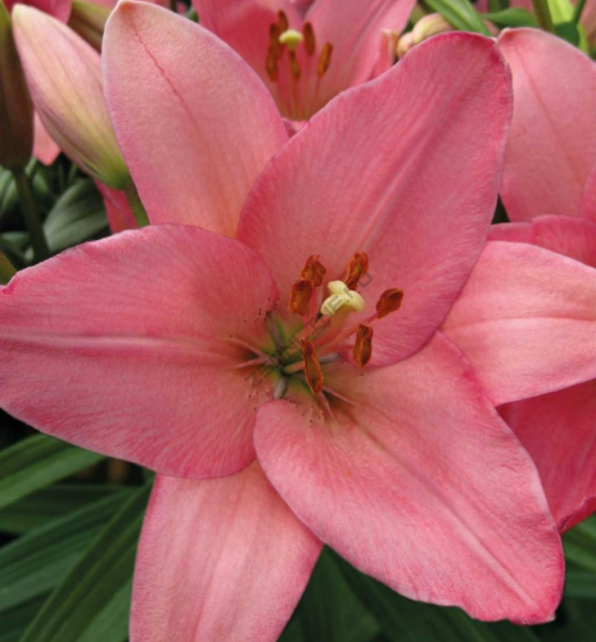 Саженцы и рассада лилии ла-гибрида Олгаве (Lilium LA-hybrid Algarve) - нежные цветы. Данный сорт можно назвать произведением искусства – так сильно каждый цветок похож на статуэтку тонкой работы. Цвет этих лилий – нежно-розовый. Ближе к самой середине соцветия можно рассмотреть тёмно-бордовые крапинки. Цветы никогда не пахнут сильно, что ценят любители тонких ароматов. Флористы также любят их, так как с ними любой букет становится краше и эстетичнее. Люди, глядя на спокойный утончённый цвет, успокаиваются и приходят в душевное равновесие.