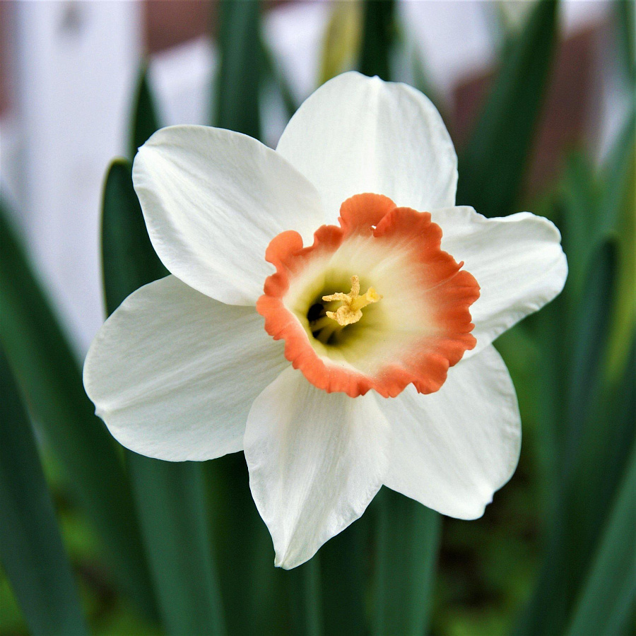 • Окраска цветка : сочетание белоснежного цвета лепестков с абрикосово- красным, волнистым краем коронки