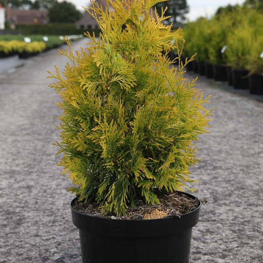 Саженцы туи западной Еллоу Риббон (Yellow Ribon) высоко ценятся за свой интересный золотистый окрас хвои. Таким образом, можно создать необычную жёлтую аллею или изгородь, применив, как вариант, крупномеры Yellow Ribon. Характеристики: